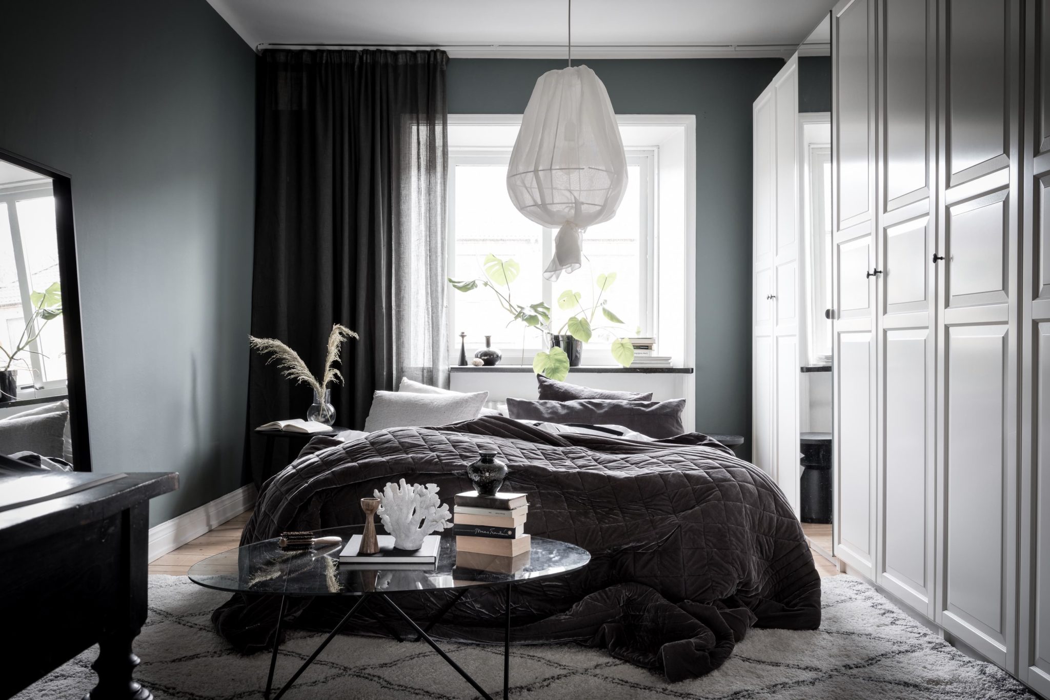 Full möblering av lägenhet från 1930-talet med vackra spegeldörrar och mörkmålade väggar. För Bjurfors Göteborg Foto Alen Cordic